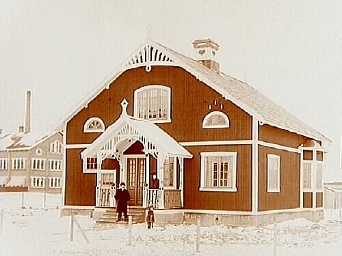 Envånings villa med burspråk och inredd vind, förstubro med snickarglädje. Tre personer framför huset.