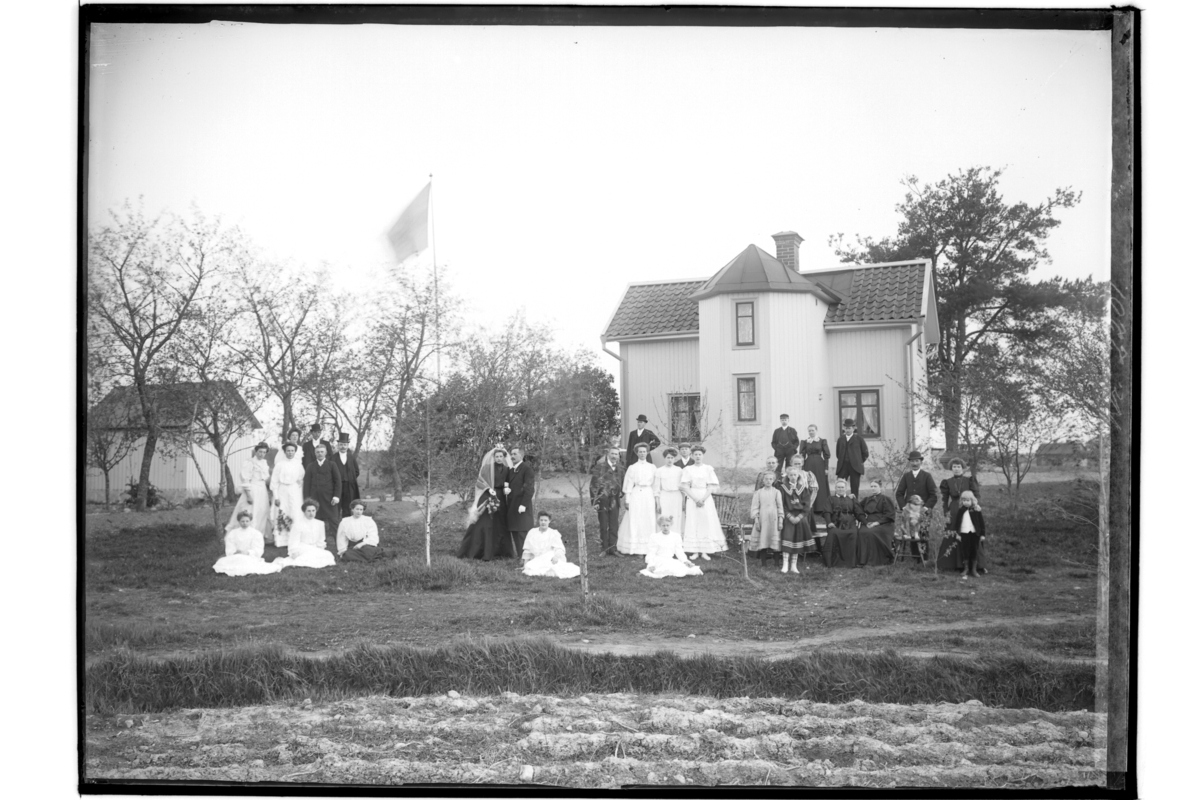 Brudpar och bröllopsgäster. Bruden i svart klänning, vit slöja, krona. Brudgummen i frack.