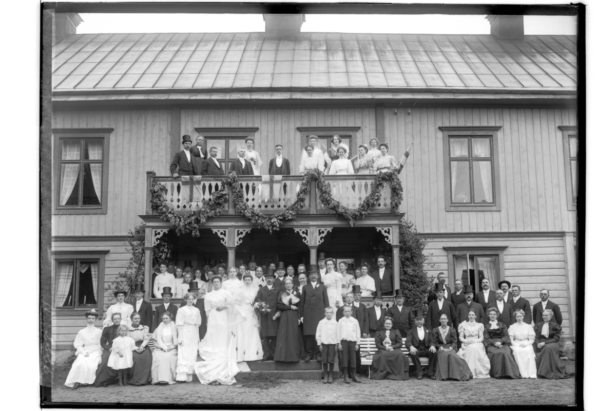 Brudpar och bröllopsgäster. Bruden helt i vitt med slöja och krona. Brudgummen i frack och hög hatt.
