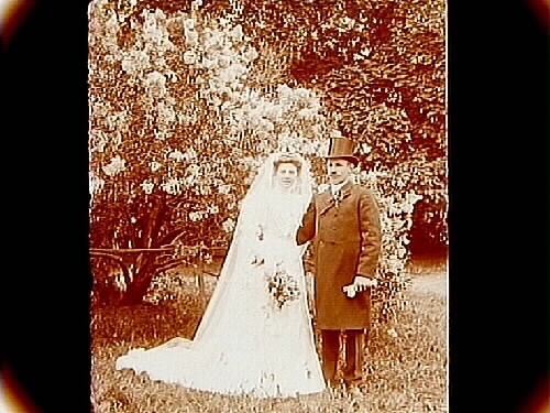 Brudpar, bruden helt i vitt, med krona, brudgummen i frack och hög hatt.