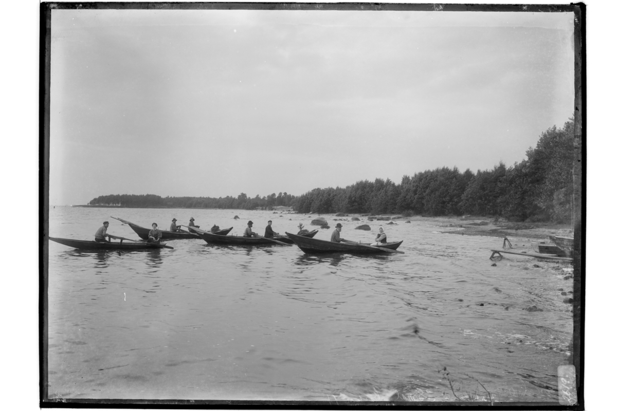 3 hjälmaresnipor med sex personer i och en eka med två personer i.