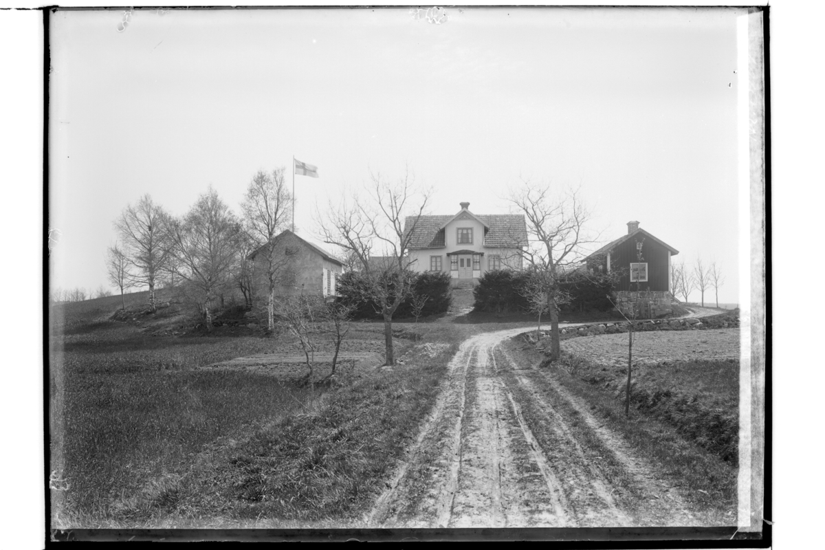 En och en halvplans bostadshus, två flygelbyggnader.