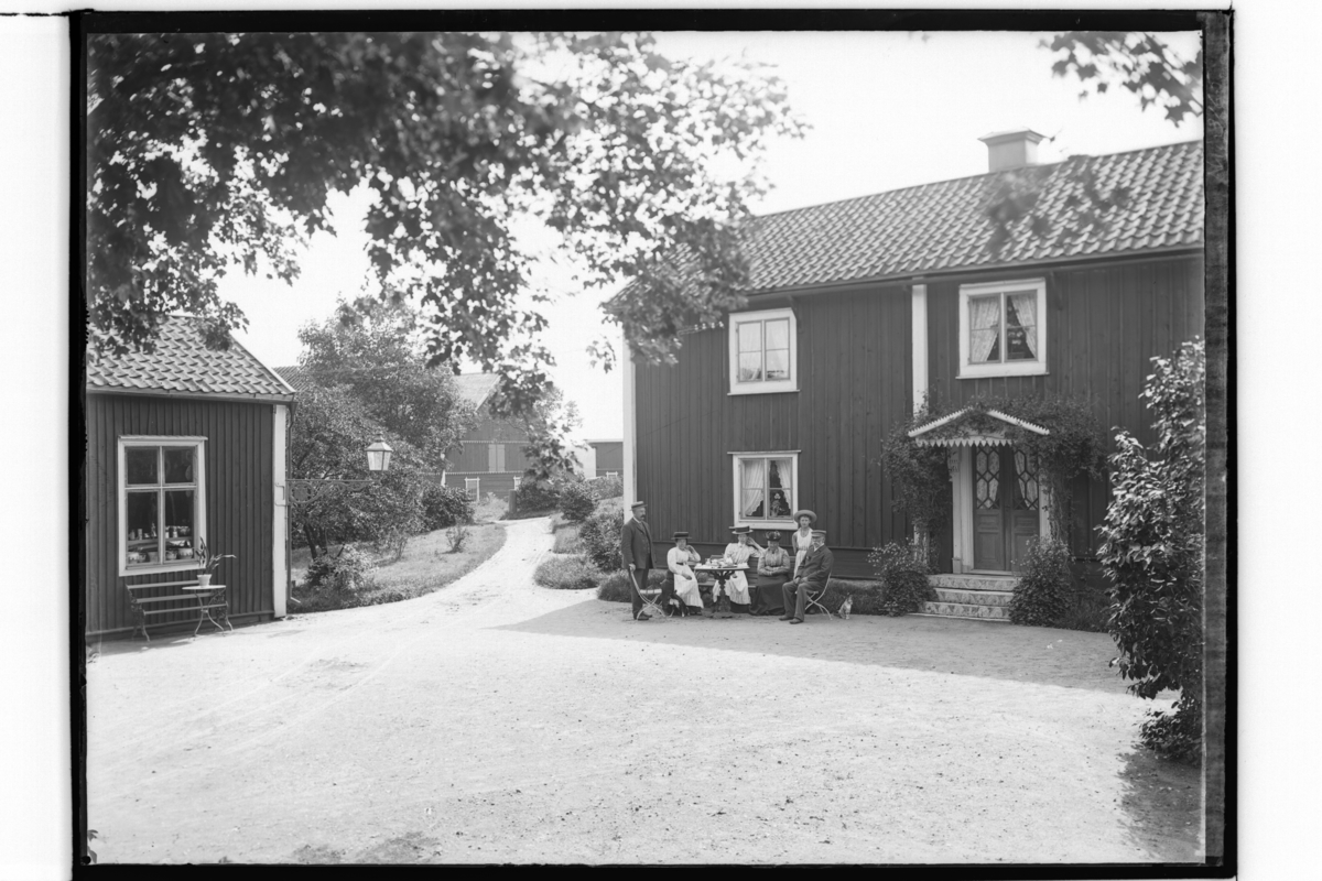 Tvåvånings bostadshus med förstebro. 6 personer framför huset. Till vänster en envånings stuga.