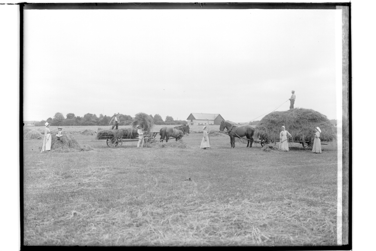 Höbärgning. 2 par hästar och 2 höskrindor, 8 personer.