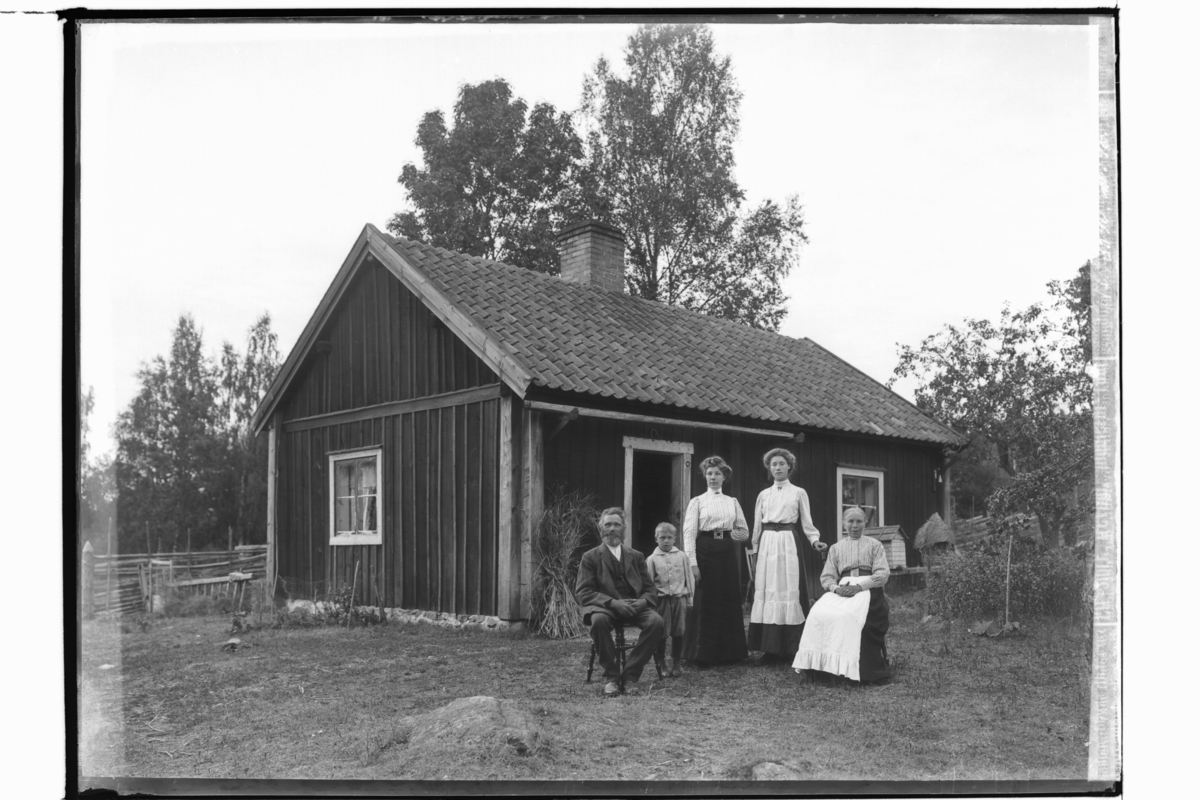Envånings torparestuga, familjegrupp 5 personer framför stugan. Tegelugnen.