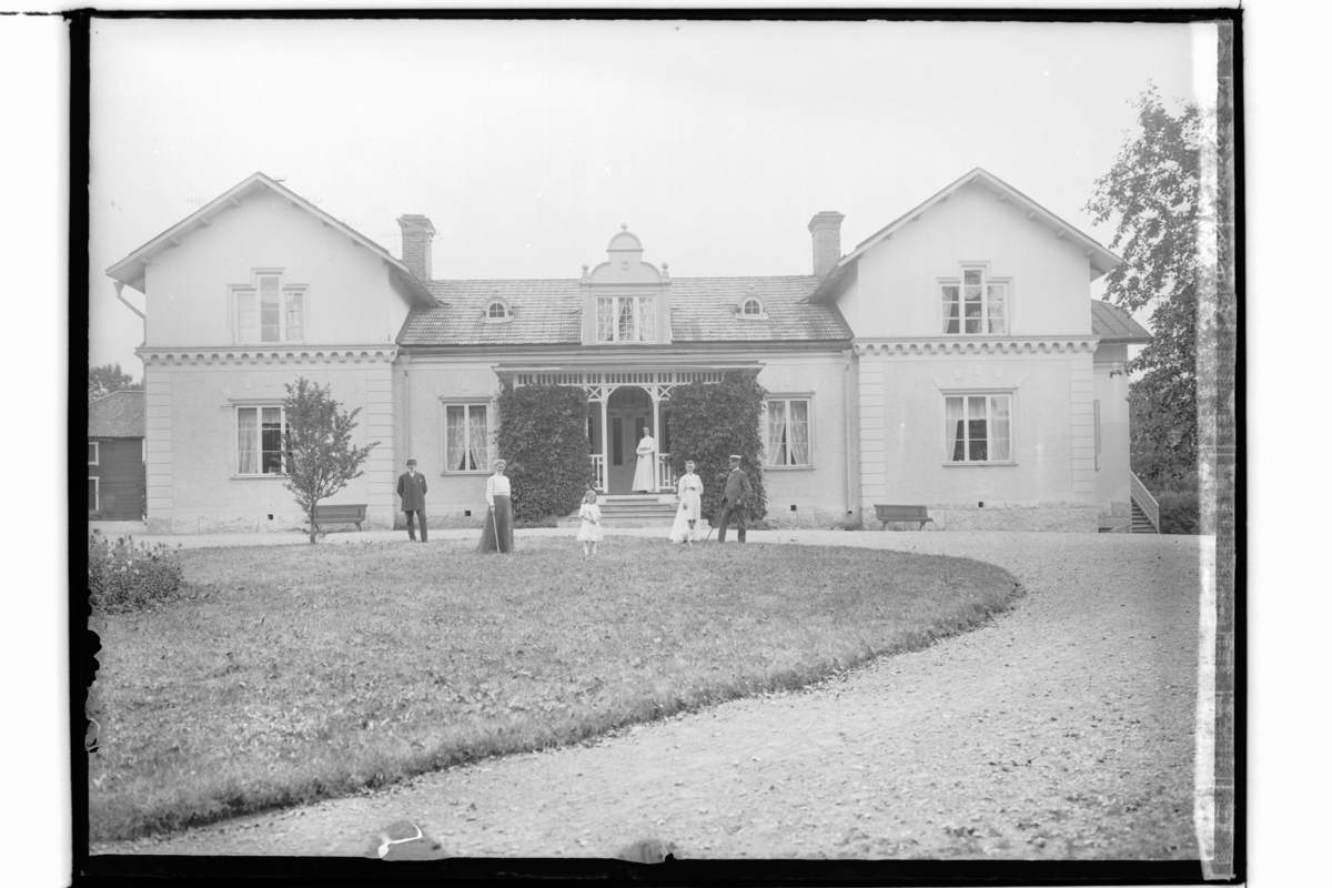 Förvaltarbostaden, tvåvånings bostadshus med förstebro. 6 personer framför huset.