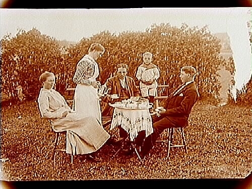 Grupp fem personer runt kaffebordet, ute i det gröna.