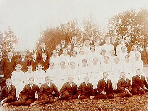 Konfirmander, 25 flickor, 20 pojkar och en präst.