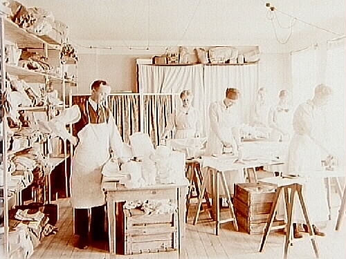 A. Lindh Tvätt & Strykinrättning, interiör av tvättstugan, 3 tvätterskor.
