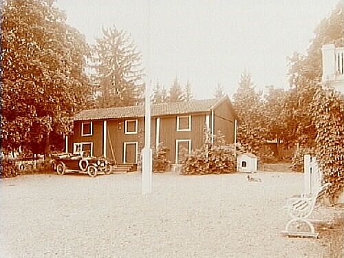 Tvåvånings ekonomibyggnad. Hund och hundkoja. Öppen 5-sitsig automobil av märket Hudson, reg. nr. T 453.
