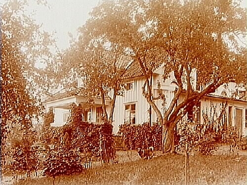 En och en halvvånings bostadshus med frontespis, förstuga, veranda och balkong. Baksidan.