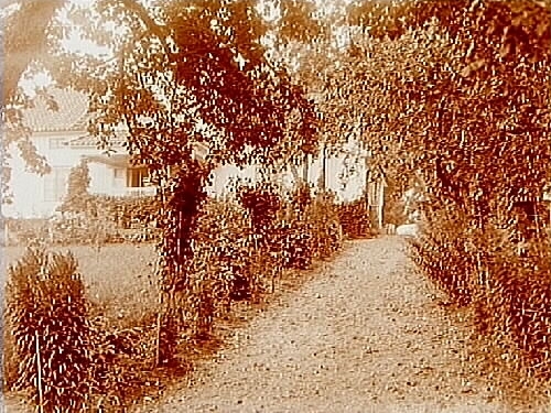 En och en halvvånings bostadshus med frontespis, förstuga, veranda och balkong. Baksidan.