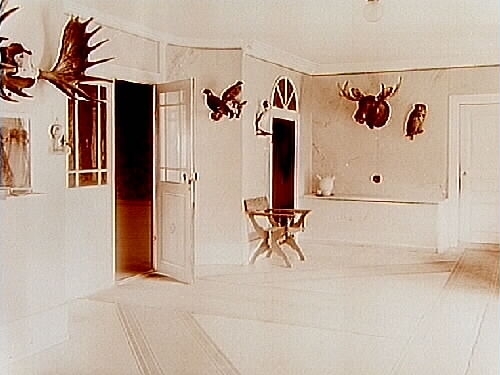 Sickelsjö gård, hallinteriör med jakttroféer.