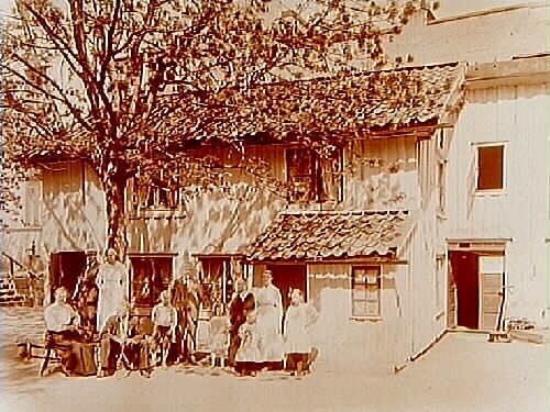 Tvåvånings bostadshus, träbyggnad, 11 personer framför huset.