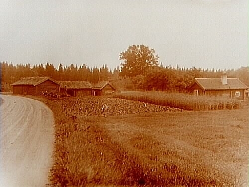 Tre ekonomibyggnader i liggtimmer, med vasstak(?). Oxe spänd för vagn.