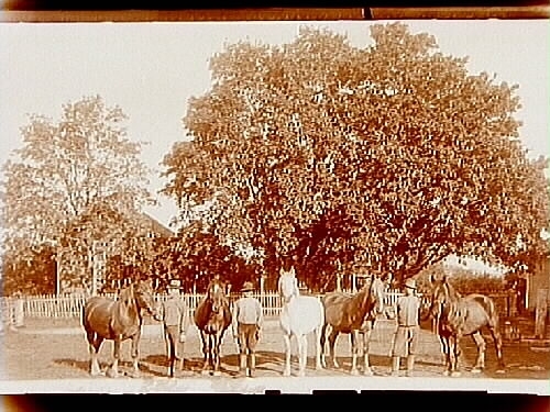 Tvåvånings bostadshus, två flygelbyggnader, fem hästar och tre män.