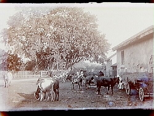 Tvåvånings bostadshus, två flygelbyggnader, ekonomibyggnader. Kossor och en höskrinda.