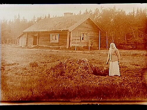 Envånings enkelstuga i liggtimmer, äldre kvinna framför stugan.