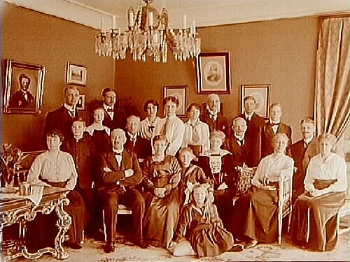 Nynäas Herrgård. Rumsinteriör. Släktgrupp med barnen 21 personer.