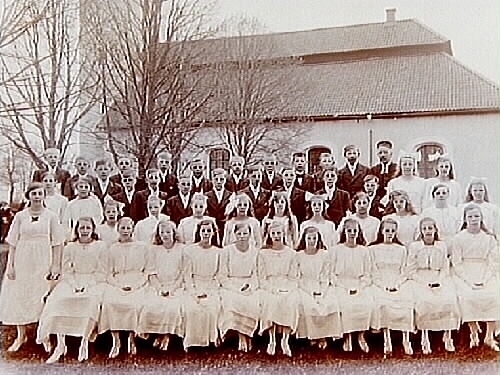 Konfirmander, 26 flickor, 19 pojkar och en präst.