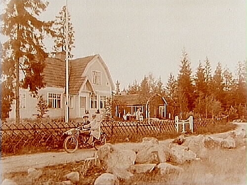 En och en halvvånings villa med brutet tak, vinkelbyggd, med förstebro. Vinkelbyggt uthus till höger om villan. 2 kvinnor och 3 barn framför uthuset. 2 män åkande motorcykel med sidovagn av märket Indian.