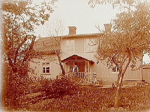 En och en halvvånings bostadshus med frontespis och förstebro med snickarglädje.