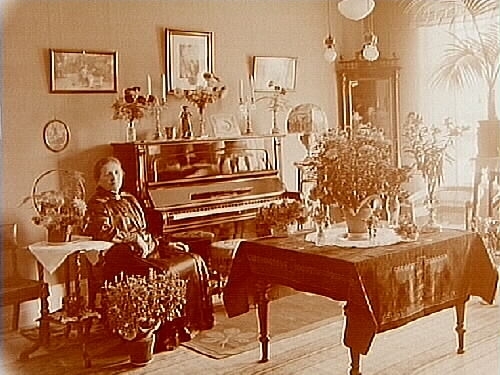 Rumsinteriör, en kvinna vid pianot.