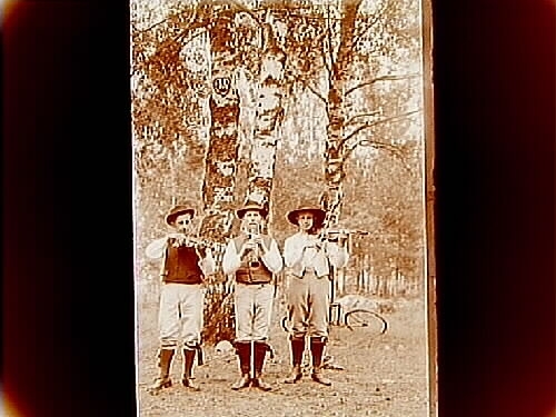 Gällersta Forngård, tre spelmän i folkdräkt.