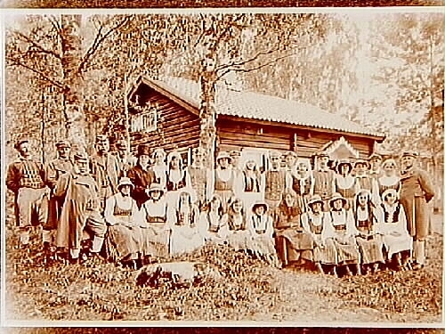 32 personer i folkdräkt utanför stugan.