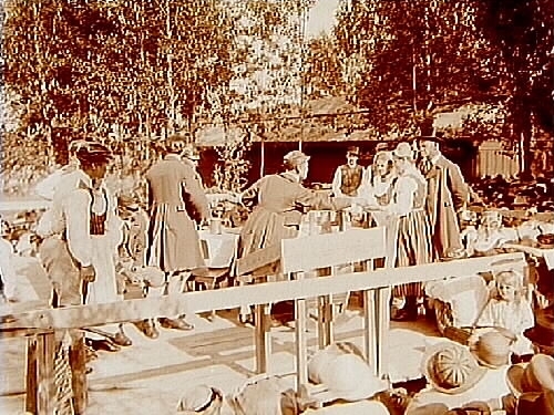 Krestningakalaset (dopkalas), 12 personer i folkdräkter. Dopceremoni.