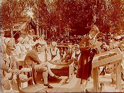 Krestningakalaset (dopkalas), 15 personer i folkdräkter. Den nydöpta i vaggan.