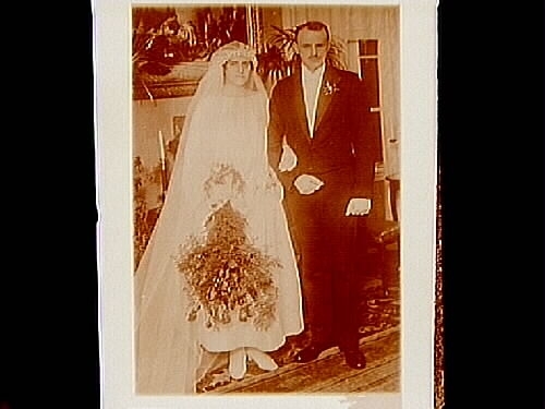 Brudpar, bruden helt i vitt med lång slöja, brudgummen i frack.