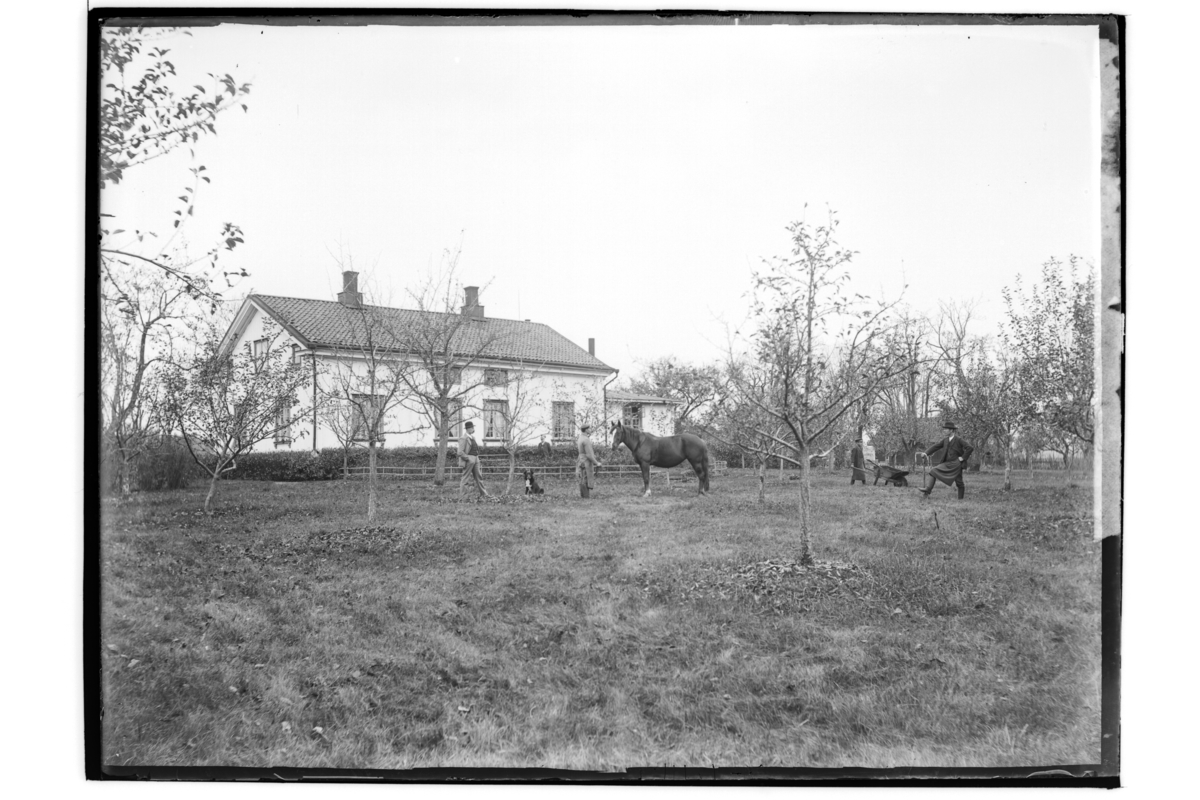 Byggnader, en och en halvvånings bostadshus, 5 personer, en hund och en häst.