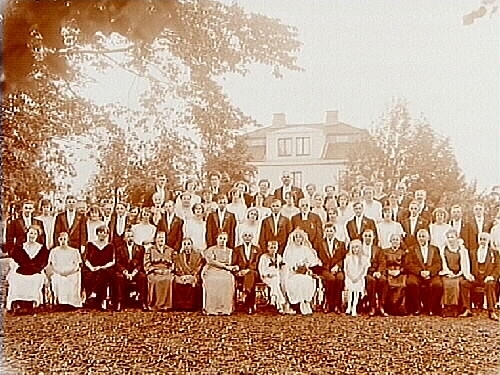Bröllop. Brudpar, bröllopsgäster, marskalkar, tärnor och brudnäbbar. Bruden helt i vitt, med lång slöja, krona. Brudgummen i frack.