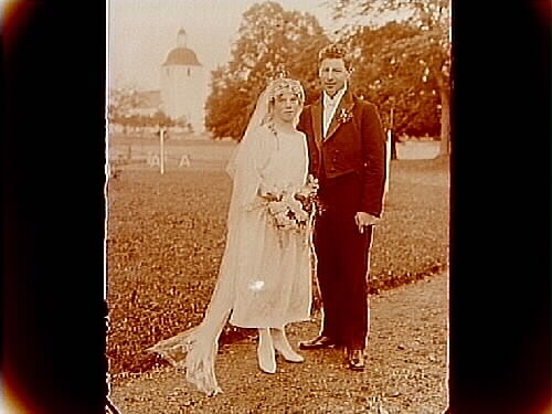 Brudpar, bruden helt i vitt med lång slöja, brudgummen i frack.