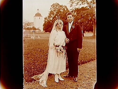 Titel: Brudpar, bruden helt i vitt med lång slöja, brudgummen i frack. Kyrkan i bakgrunden. Folkskollärare Ivar Hellin (Hugo Johansson)