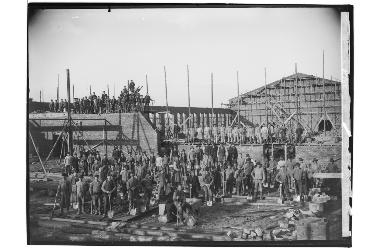 Fabriksbyggnad under byggnad och byggnadsarbetare.