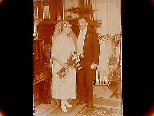 Brudpar, bruden helt i vitt med kort slöja, brudgummen i frack.