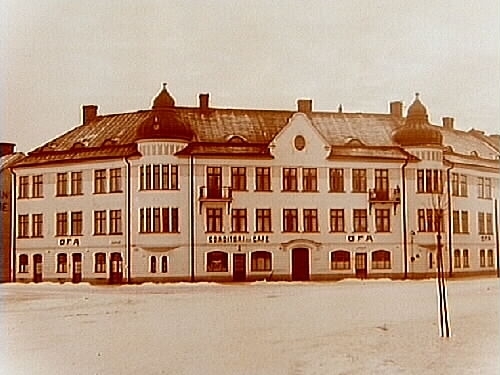 Trevånings hus i trä med tresidig gatufasad i gul slätputs, mot söder två balkonger med dekorativ smide, frontespis med profilerad kontur samt hörntorn med svängda huvar. I bottenvåningen med putsrustik, inkörsport och butiksfönster.