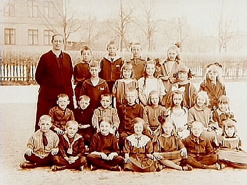 Rudbecksskolan, 24 skolbarn med lärarinna på skolgården.