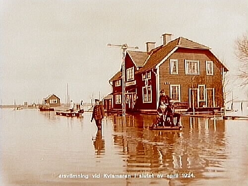 Kvismare järnvägsstation, tvåvånings stationsbyggnad med frontespis och brutet tak. Tre personer på en dressin. En stationskarl.