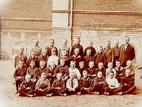 Norra Folkskolan, 35 skolpojkar med magister Folke Olsson ute på skolgården framför skolan.
