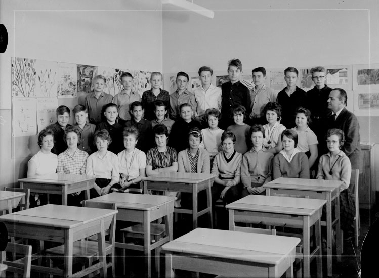 Olaus Petriskolan, klassrumsinteriör, 29 skolbarn med lärare Nils Boqvist.