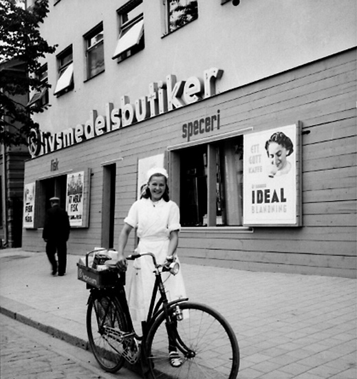 Titel: Konsums springflickor, en flicka med cykel. Affärsbyggnad i bakgrunden.