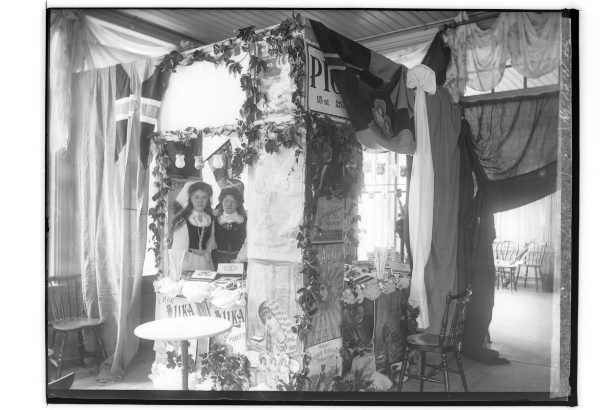 Tobaksstånd, två kvinnor i nationaldräkter.