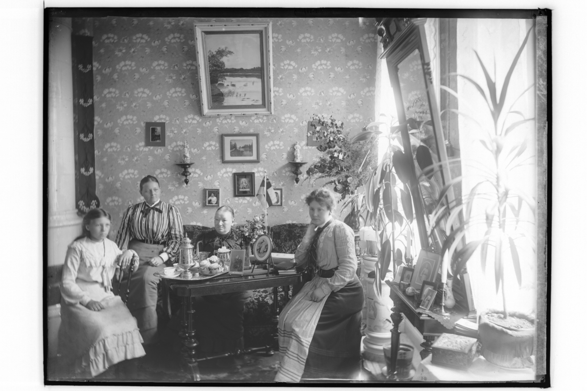 Rumsinteriör, 4 kvinnor runt kaffebordet.