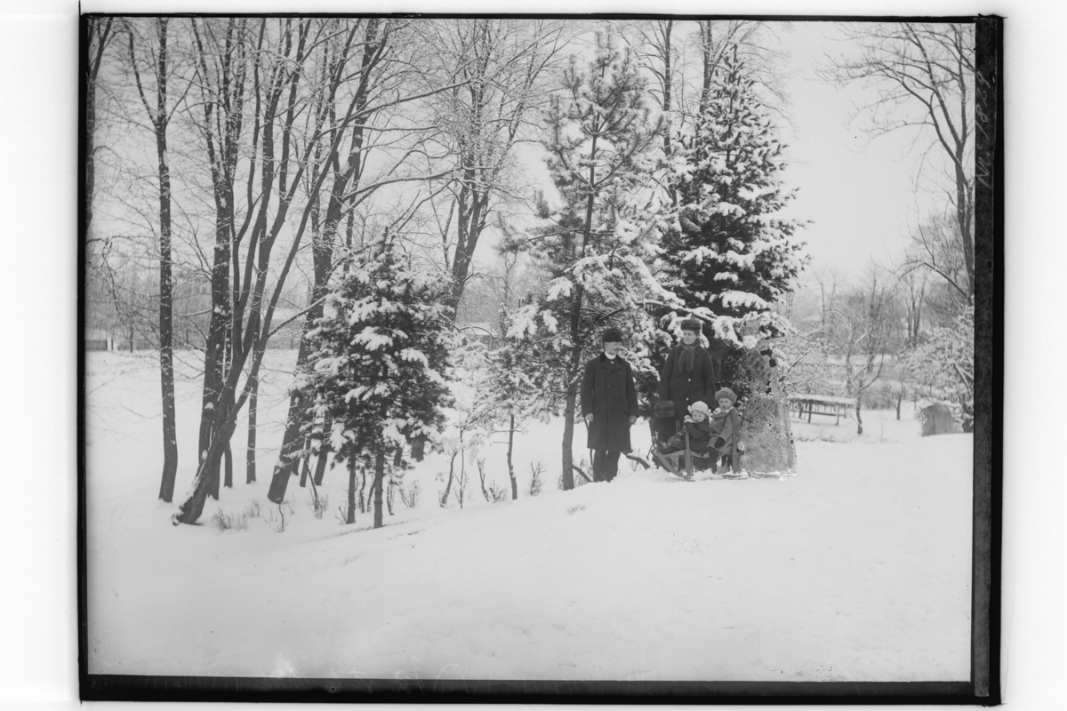 Familj 5 personer, 3 vuxna och 2 barn på en kälke.