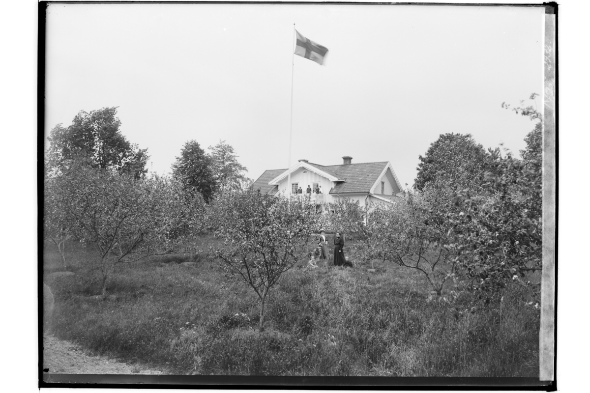 Envånings bostadshus med inredd vind, frontespis, balkong och veranda, fyra personer på balkongen, två kvinnor och ett barn i trädgården.