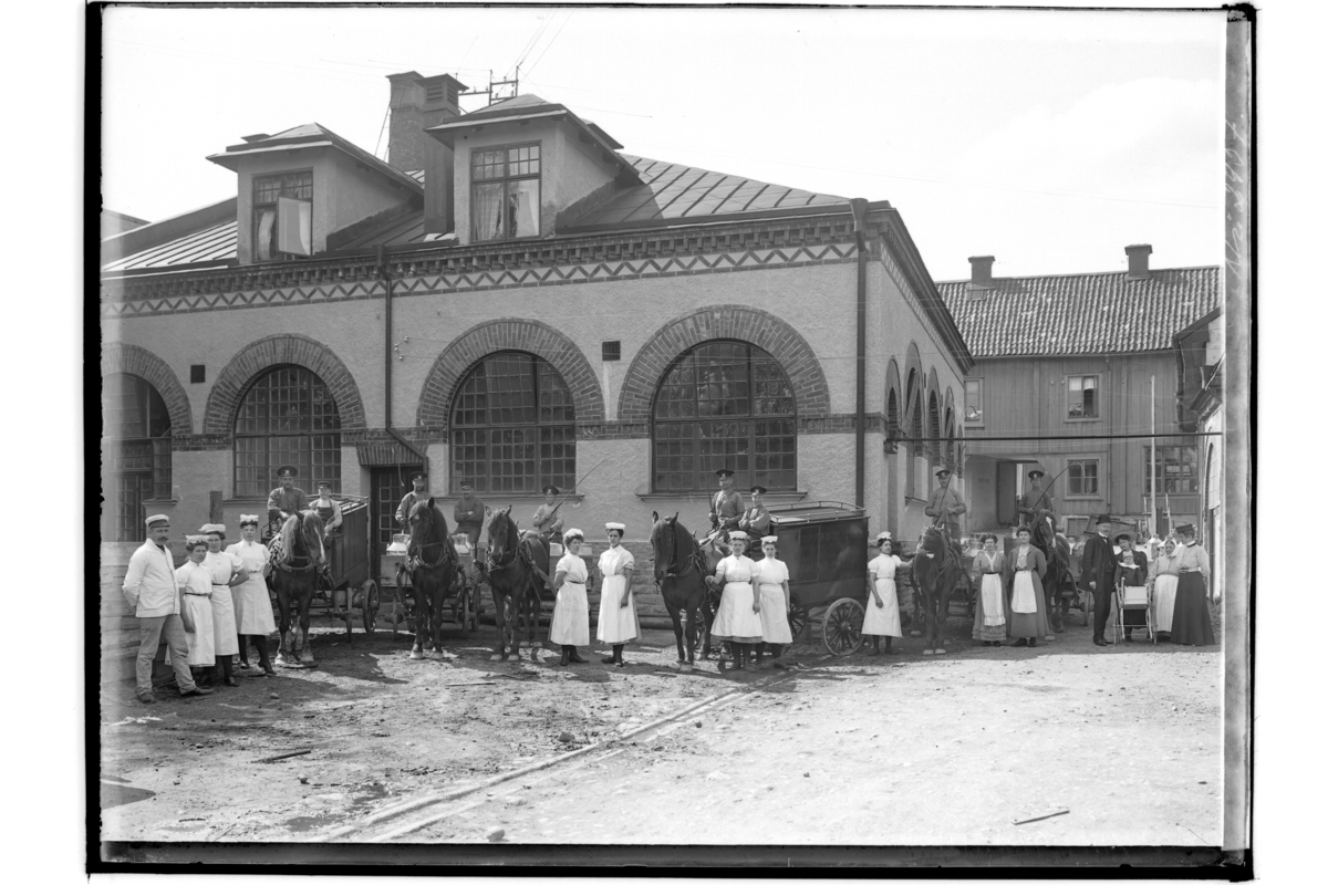 24 personer, 6 mjölkvagnar med förspända hästar.