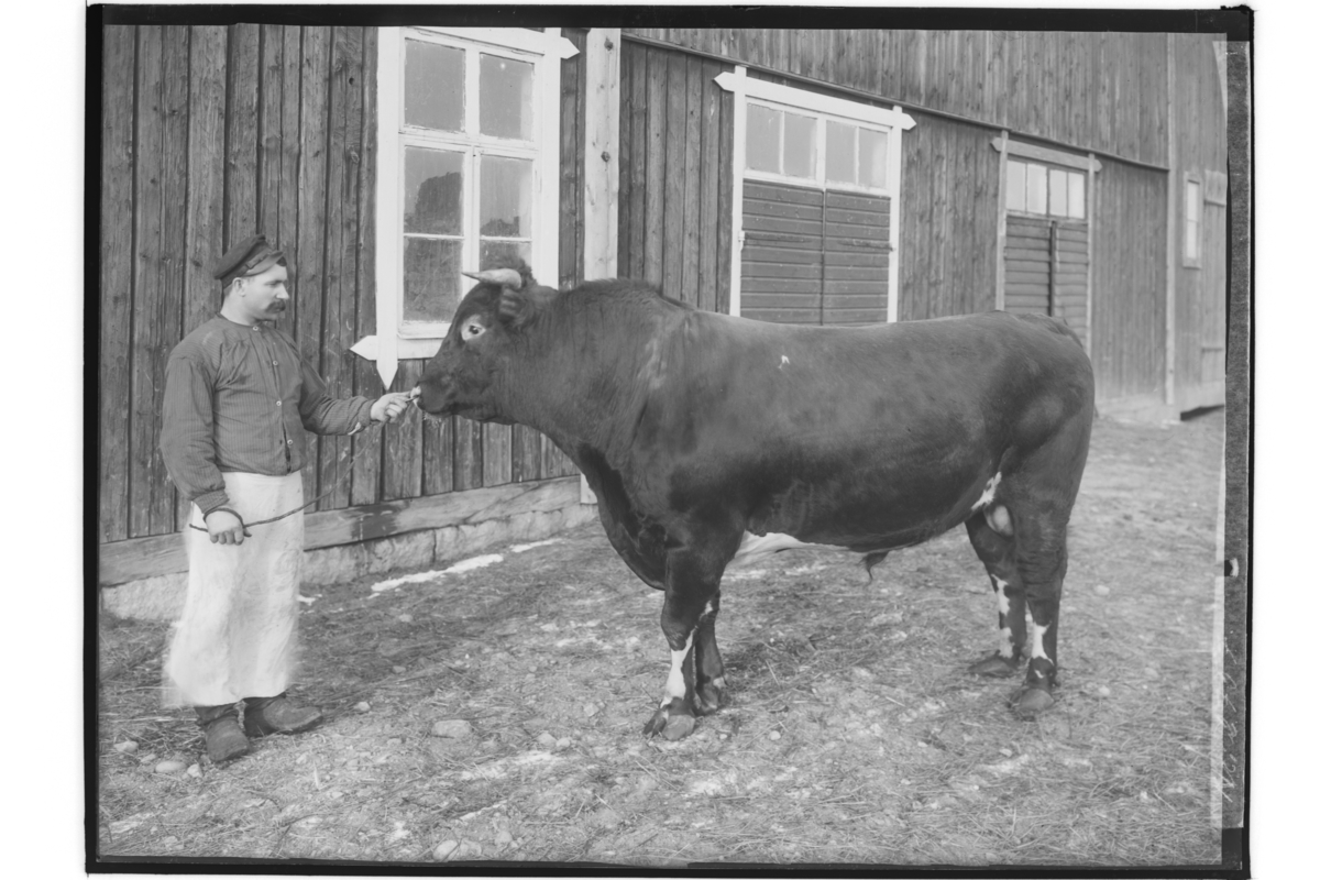 Segersjö Herrgård, ekonomibyggnad, en man med tjur.